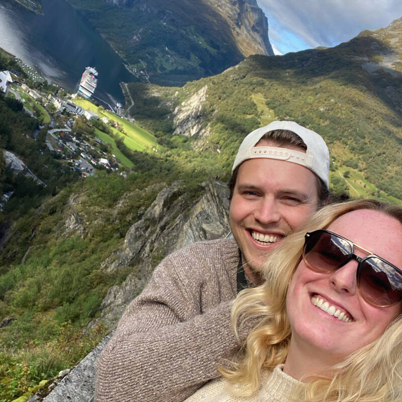 Het is zo ontzettend bijzonder als je wakker wordt, je gordijnen open doet en je opeens uitkijkt op een soort ansichtkaartje. Na twee nachten en één dag varen, werden we wakker tussen de bergen van Hellesylt in de Fjorden van Noorwegen. Adembenemend! We sprongen enthousiast uit bed en fristen onszelf snel op, om vervolgens vanaf het balkon naar buiten te kijken. Hoe leuk, dat je gewoon je tanden staat te poetsen tussen al die bergen. Al snel werd er omgeroepen dat we waren aangekomen in Hellesylt en dat we naar buiten konden kijken, om de Seven Sisters watervallen te spotten. Helaas was dit aan de andere kant van het schip, maar wij hadden uitzicht op een andere waterval, die ook wel ''De aanbidder'' van de Seven Sisters wordt genoemd. Het schijnt dat mensen hier een fles in zien, omdat de waterval - zo luidt het verhaal - verliefd zou zijn op de zeven zussen, maar nooit bij ze kon komen en daarom naar de fles greep. Zie jij de fles in de onderstaande waterval?